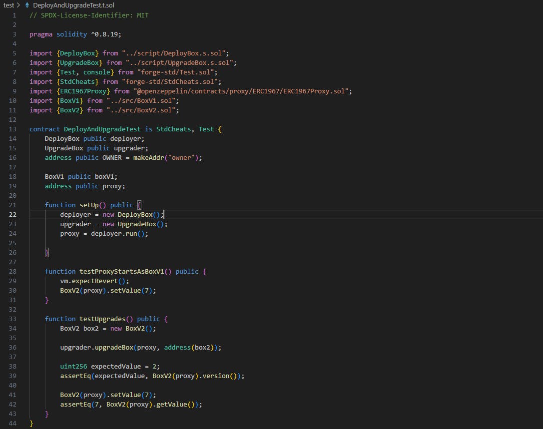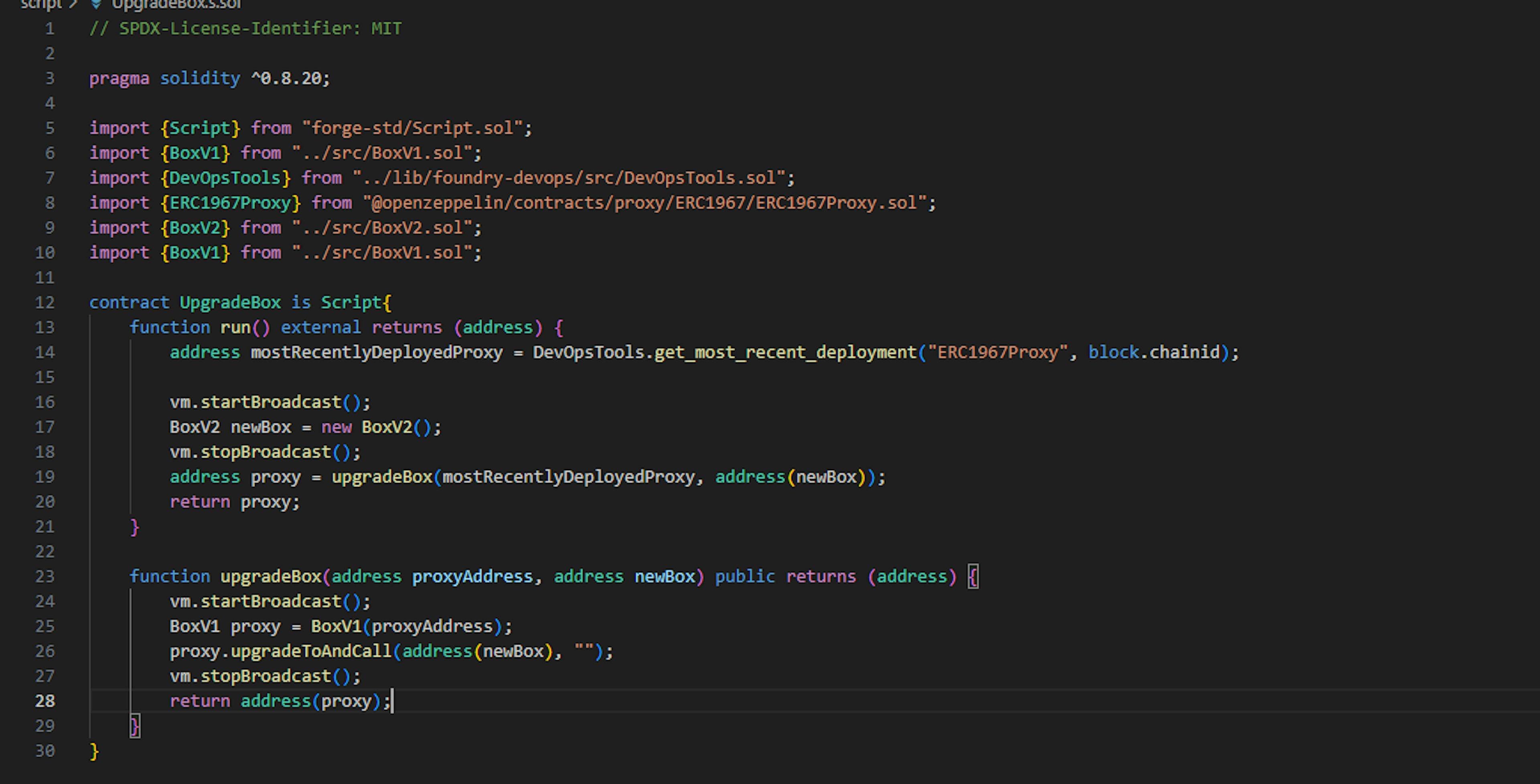 - BoxV1 and BoxV2: Developed two versions of the Box contract, where BoxV1 contains basic functionality and BoxV2 adds new features, demonstrating the upgrade process.