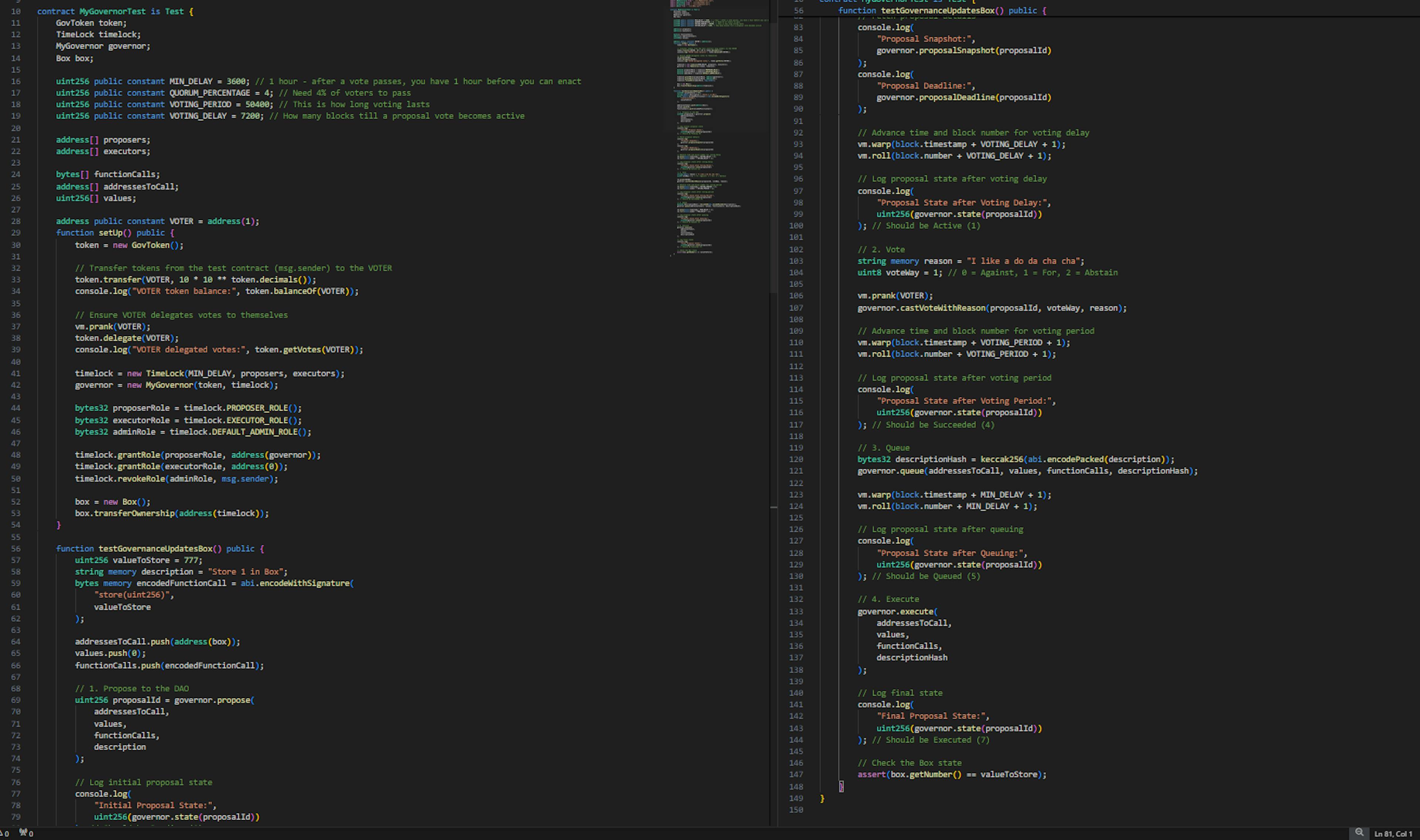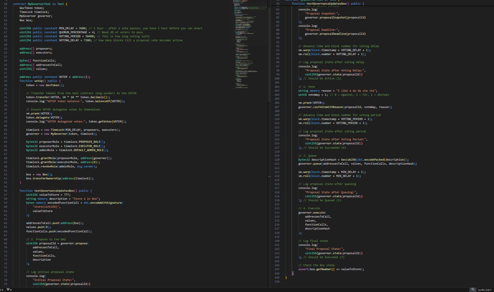 - Time Manipulation: Used Foundry's tools to manipulate time and block numbers, simulating the passage of time for testing the proposal lifecycle.