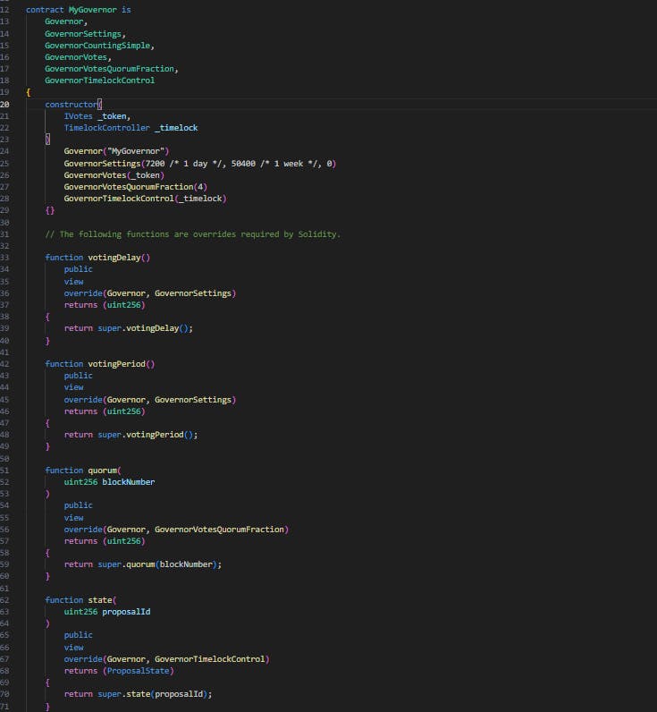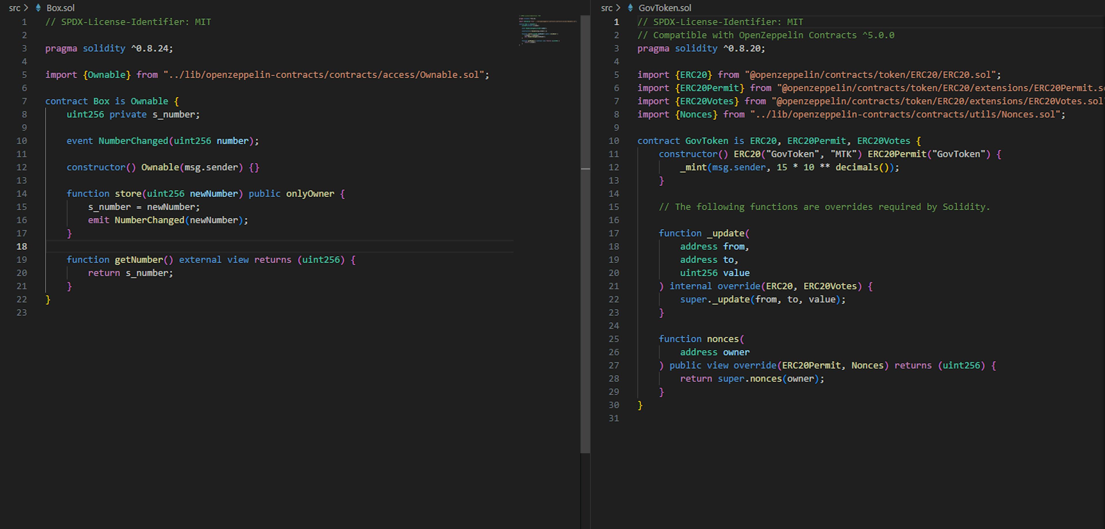 - Governor Contract: Utilized OpenZeppelin’s Governor contract to manage proposals, voting, and execution of decisions.