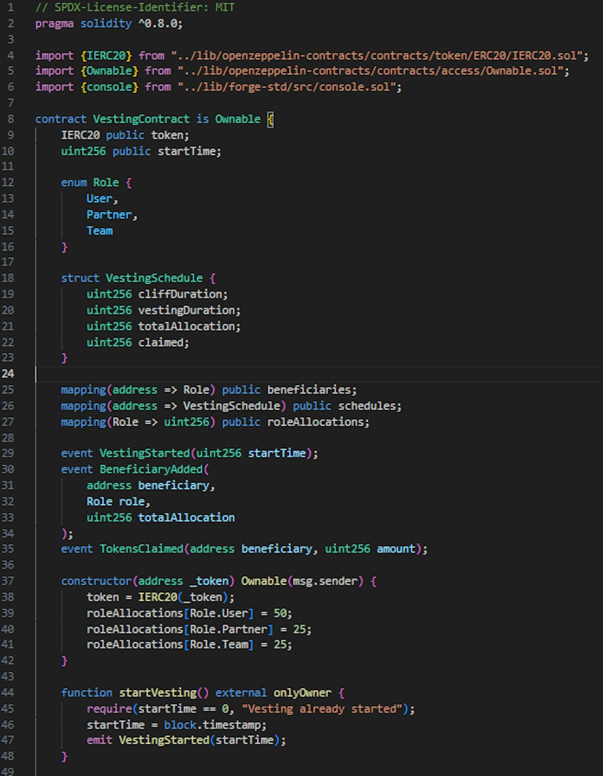 - Efficiency: Demonstrated efficiency in developing and deploying a complex vesting mechanism on the blockchain.