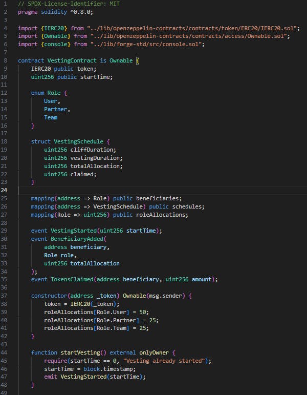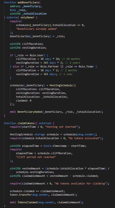 - Event Tracking: Emits events for vesting start, beneficiary addition, and token withdrawal.